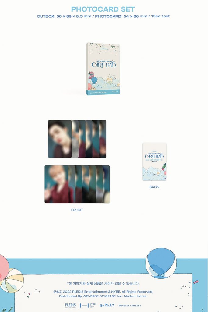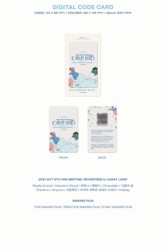 Oficjalne DVD 2021 SEVENTEEN in CARAT LAND MEMORY BOOK + DIGITAL CODE od SEVENTEEN. Zestaw miał swoją premierę 27 lutego 2022r. W skład setu wchodzi m.in. Photobook (180str.), Digital Code Card, Love Letter (1szt.), Postcard (1szt.), Accordion Postcard (1szt.), Photocard Set (1 zestaw 13szt.).