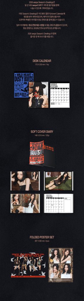 Oficjalny produkt aespa 2026 SEASON’S GREETINGS. Produkt będzie miał swoją premierę w Korei 22 grudnia 2025r. Zawartość  prezentowana na zdjęciach.