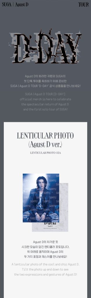 Oficjalny produkt Agust D D-DAY TOUR Lenticular Photo (Agust D ver.). Produkt miał swoją premierę w Korei 1 sierpnia 2023r.