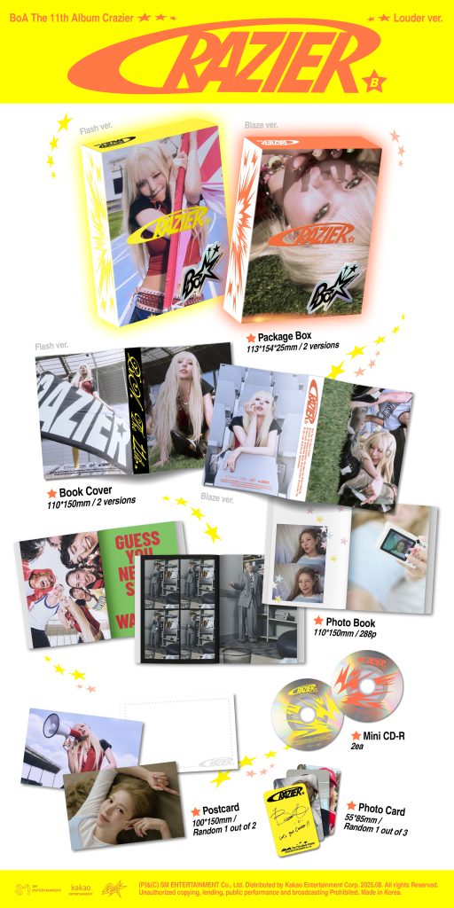 Oficjalna płyta 11th Album Crazier od BoA w edycji Louder w losowej wersji (w komentarzu do zamówienia możesz wpisać ranking wersji (od najbardziej pożądanej do najmniej) wyślemy konkretną wersję w oparciu o Twój ranking i dostępność wersji na magazynie. W przypadku zakupu 2szt. albumów zostaną wysłane różne wersje). Album miał swoją premierę 4 sierpnia 2025 roku.