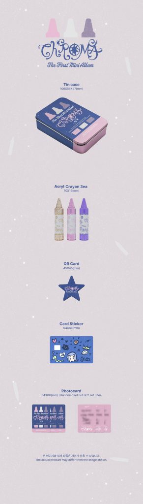 Oficjalny album 1st Mini Album Chroma od Hebi w edycji Crayon w losowej wersji (w komentarzu do zamówienia możesz wpisać ranking wersji (od najbardziej pożądanej do najmniej) wyślemy konkretną wersję w oparciu o Twój ranking i dostępność wersji na magazynie). Album miał swoją premierę 22 kwietnia 2025 roku.
