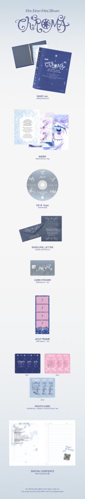 Oficjalna płyta 1st Mini Album Chroma od Hebi w edycji Diary w losowej wersji (w komentarzu do zamówienia możesz wpisać ranking wersji (od najbardziej pożądanej do najmniej) wyślemy konkretną wersję w oparciu o Twój ranking i dostępność wersji na magazynie). Album miał swoją premierę 22 kwietnia 2025 roku.
