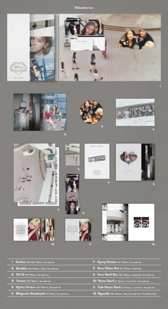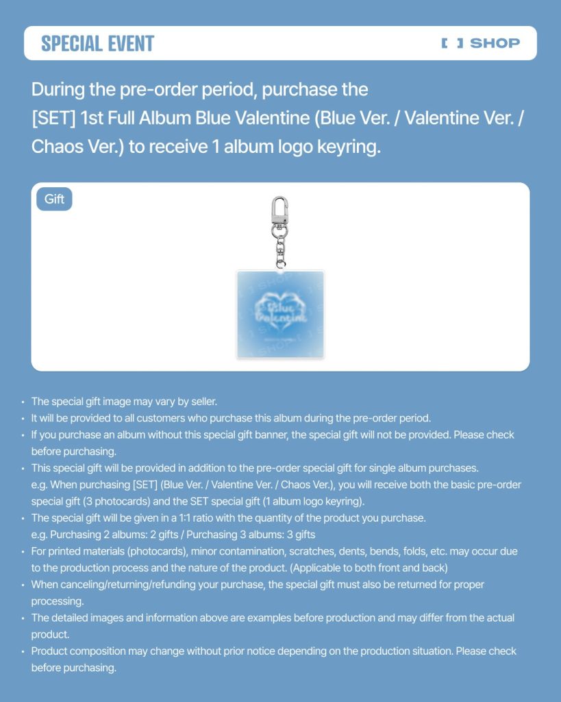 Kupując wersję Blue lub Valentine lub Chaos albumu otrzymasz 1szt. sztukę albumu w wybranej wersji oraz dodatek od FANS SHOP (dawny JYP SHOP): 1szt. photocard (losowo 1 z 6 wersji).