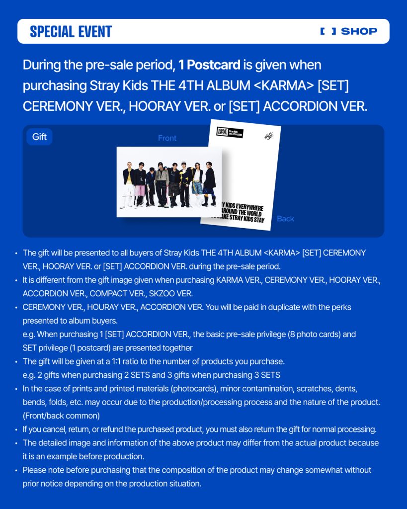 Do każdego preorderowego albumu Stray Kids KARMA kupionego w okresie preorderu (do 21.08.2025r. włącznie) dodana zostanie przygotowana specjalnie na ten comeback nieoficjalna karta kolekcjonerska od naszego sklepu 🙂