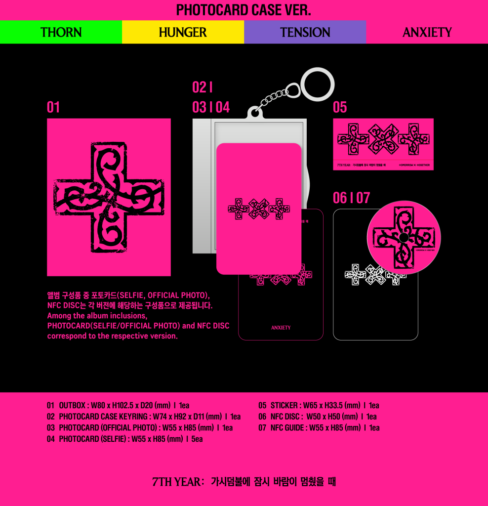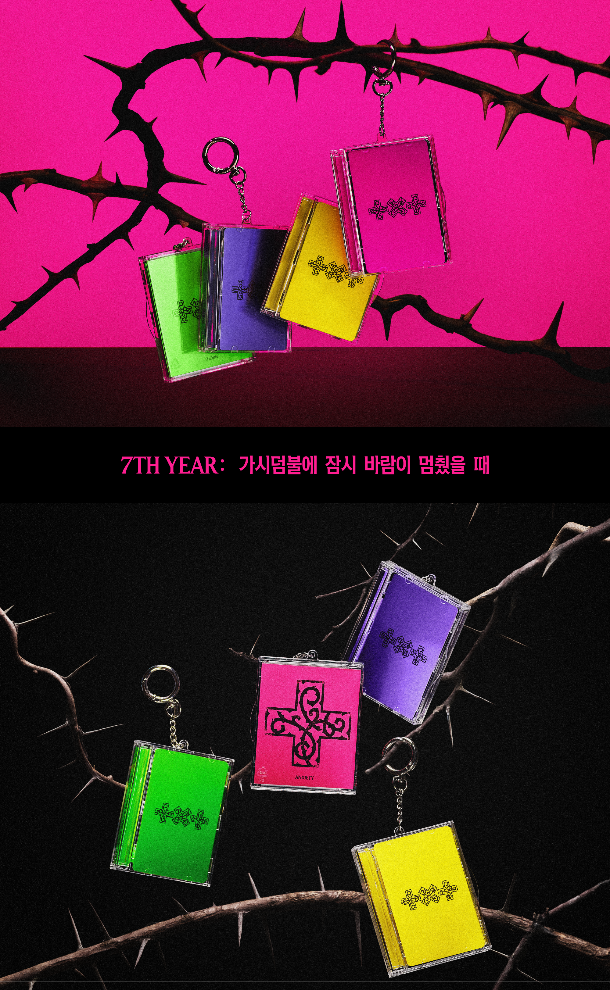 Oficjalna płyta 7TH YEAR: A Moment of Stillness in the Thorns 7TH YEAR : 가시덤불에 잠시 바람이 멈췄을 때 kpopowego zespołu TXT w edycji Photocard Case w wersjach do wyboru LOSOWA (1 z 4 wersji) lub SET (zestaw 4 wersji). Album będzie miał swoją premierę 13 kwietnia 2026 roku.