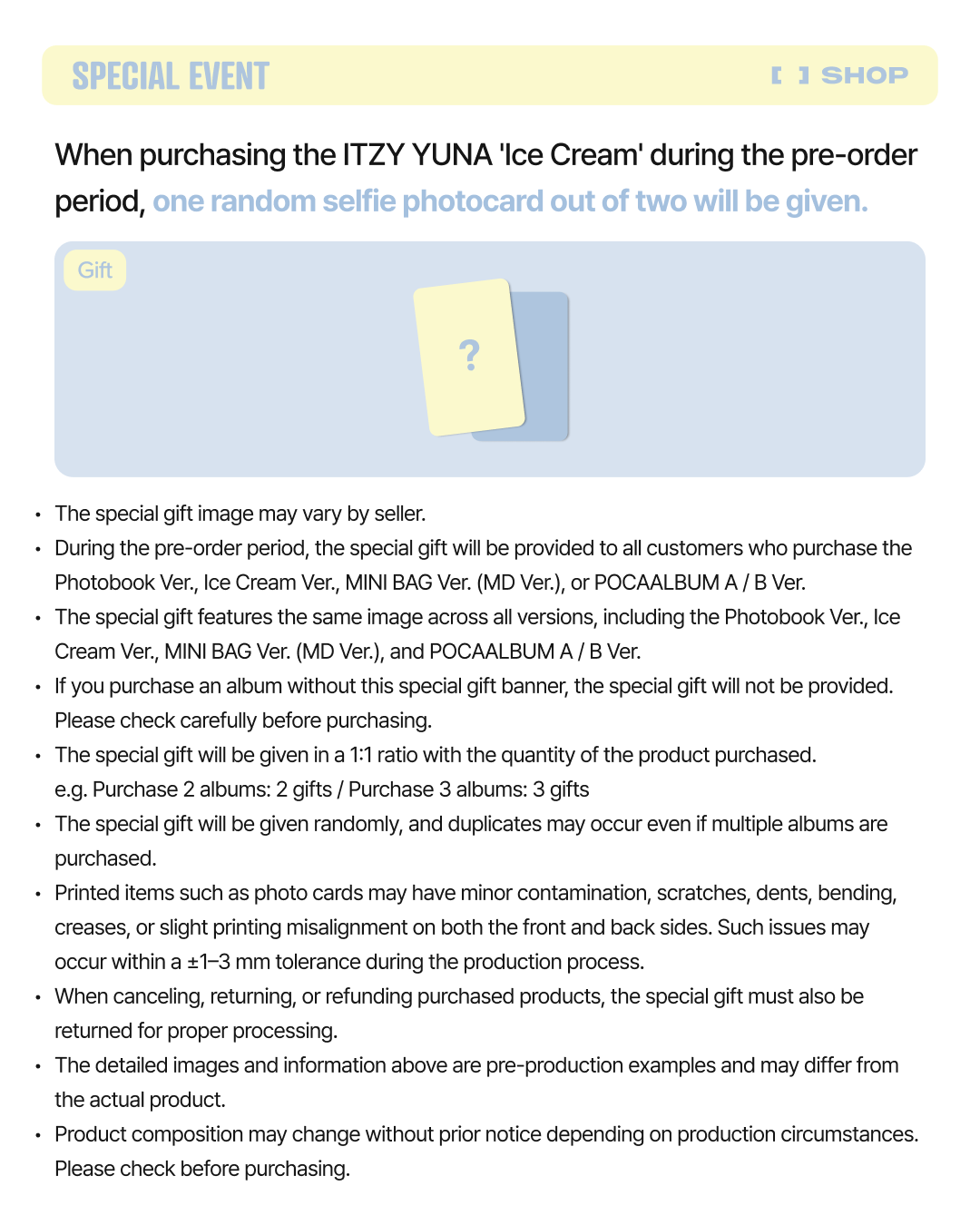 Karty dodawane przez FANS SHOP do zakupionych albumów w wersjach: Photobook/POCAALBUM/MINI BAG MD/Ice Cream posiadają takie same grafiki i dodawane są w losowych wersjach 1 z 2. W przypadku zakupu kilku sztuk/wersji albumów z dodatkami FANS będziemy starali się dołączyć różne wersje dodatków.