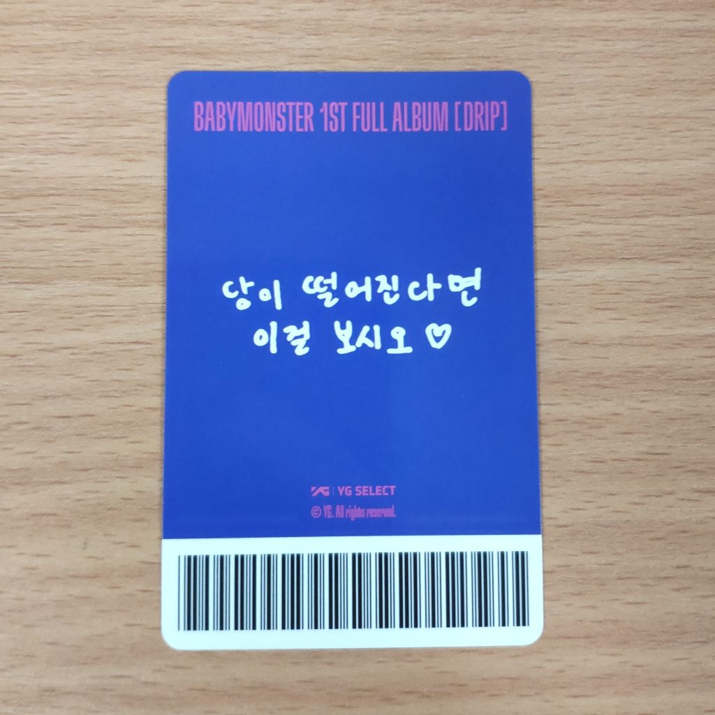 BABYMONSTER DRIP YG Shop POB PHOTOCARD TYPE A – dodatek od YG Shop dodawany w preorderze do zakupu albumu BABYMONSTER DRIP. Kupujesz 1szt. photocard w prezentowanym na zdjęciu wzorze.