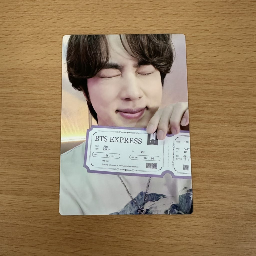 BTS 2021 MUSTER SOWOOZOO Mini Photo Card SPECIAL JIN – specjalna limitowana karta dodawana do zakupu 10 SETów kart BTS 2021 MUSTER SOWOOZOO. Kupujesz 1szt. photocard w prezentowanym na zdjęciu wzorze.