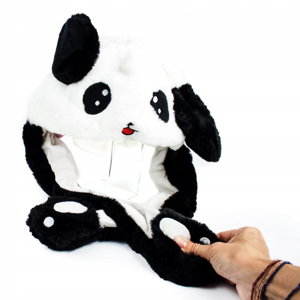 Znacie czapki królicze uszy? Teraz pora na pandę! 😀 Aby podnieść któreś z uch (lub oba na raz) wystarczy ścisnąć wiszące łapki!