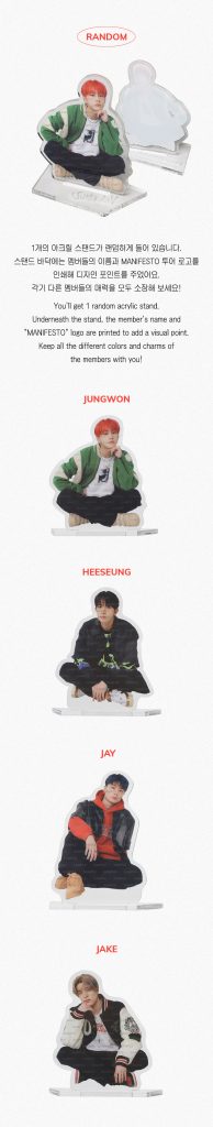 Oficjalny produkt ENHYPEN WORLD TOUR MANIFESTO LUCKY DRAW koreańskiego zespołu ENHYPEN. Produkt ma swoją premierę w Korei 30 sierpnia 2022r. Kupujesz 1 losową sztukę mini acrylic stand (figurka wysyłana jest przez wytwórnię z Korei losowo, nie ma możliwości wyboru członka zespołu).