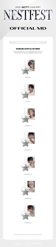 Oficjalny produkt GOT7 NESTFEST RANDOM ACRYLIC KEYRING. Produkt ma swoją premierę w Korei 5 marca 2025r. Kupujesz 1szt. losowego breloczka oraz 1szt. losowej photocard.