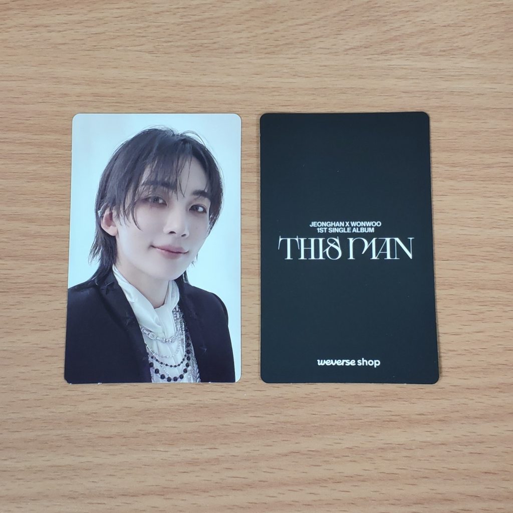 JEONGHAN X WONWOO THIS MAN WEVERSE POB PHOTOCARD TYPE C – dodatek od Weverse dodawany w preorderze do zakupu albumu JEONGHAN X WONWOO THIS MAN. Kupujesz 1szt. photocard z członkiem zespołu: JEONGHAN w prezentowanym na zdjęciu wzorze.