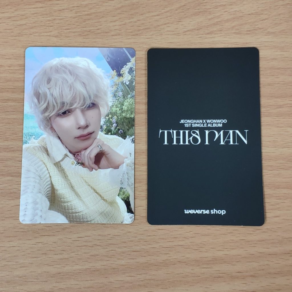 JEONGHAN X WONWOO THIS MAN WEVERSE POB PHOTOCARD TYPE D – dodatek od Weverse dodawany w preorderze do zakupu albumu JEONGHAN X WONWOO THIS MAN. Kupujesz 1szt. photocard z członkiem zespołu: JEONGHAN w prezentowanym na zdjęciu wzorze.