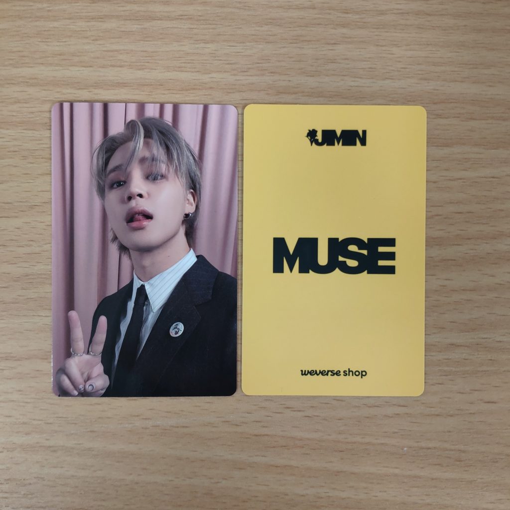 Jimin MUSE WEVERSE POB EARLY BIRD TYPE A – limitowany dodatek od Weverse dodawany w preorderze do zakupu wszystkich 3 wersji albumu Jimin MUSE przez limitowany czas. Kupujesz prezentowaną na zdjęciu  1szt. unreleased selfie photocard.
