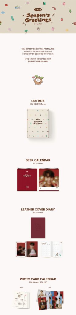 Oficjalny produkt KIM JUNSU 2026 SEASON’S GREETINGS FROM JUNSU. Produkt będzie miał swoją premierę w Korei 26 grudnia 2025r. Zawartość prezentowana na zdjęciach.
