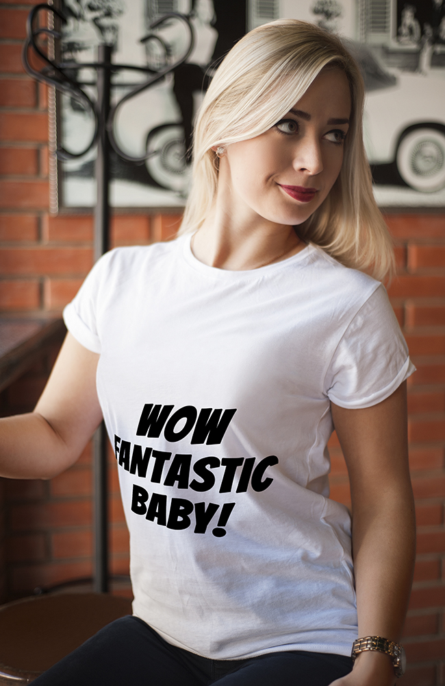 Damska koszulka w kolorze białym z napisem WOW FANTASTIC BABY!