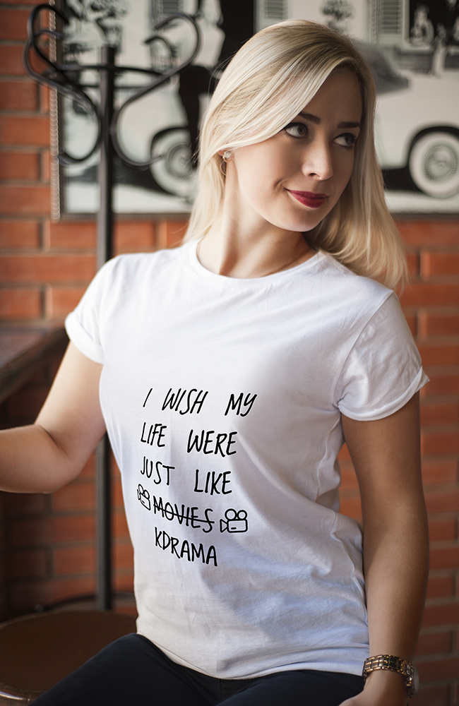 Damska koszulka w kolorze białym z napisem I WISH MY LIFE WERE JUST LIKE MOVIES KDRAMA