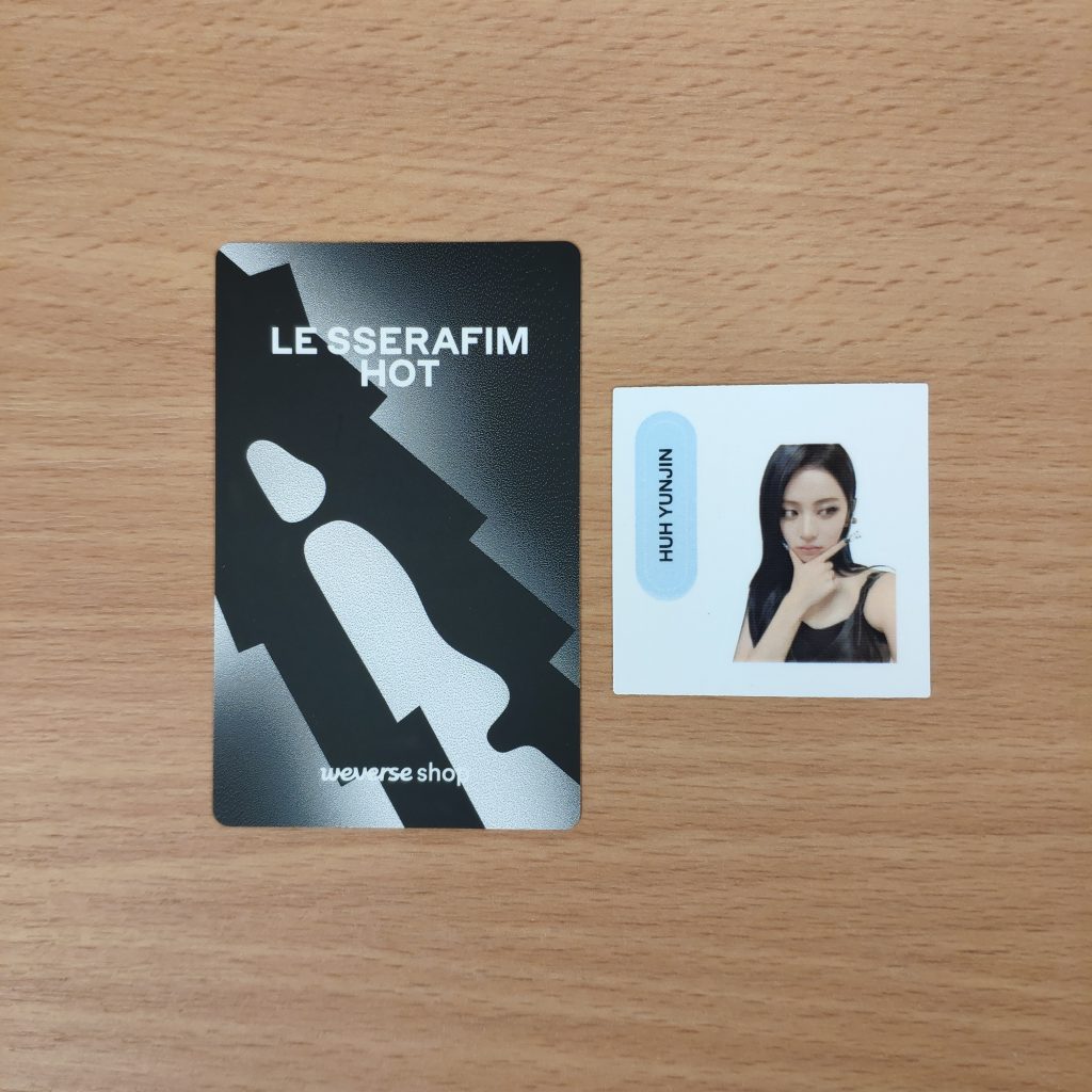 LE SSERAFIM HOT (COMPACT ver.) WEVERSE POB PHOTOCARD YUNJIN – dodatek od Weverse dodawany w preorderze do albumu LE SSERAFIM HOT (COMPACT ver.). Kupujesz 1szt. photocard + 1szt. photo sticker z członkinią zespołu: YUNJIN.