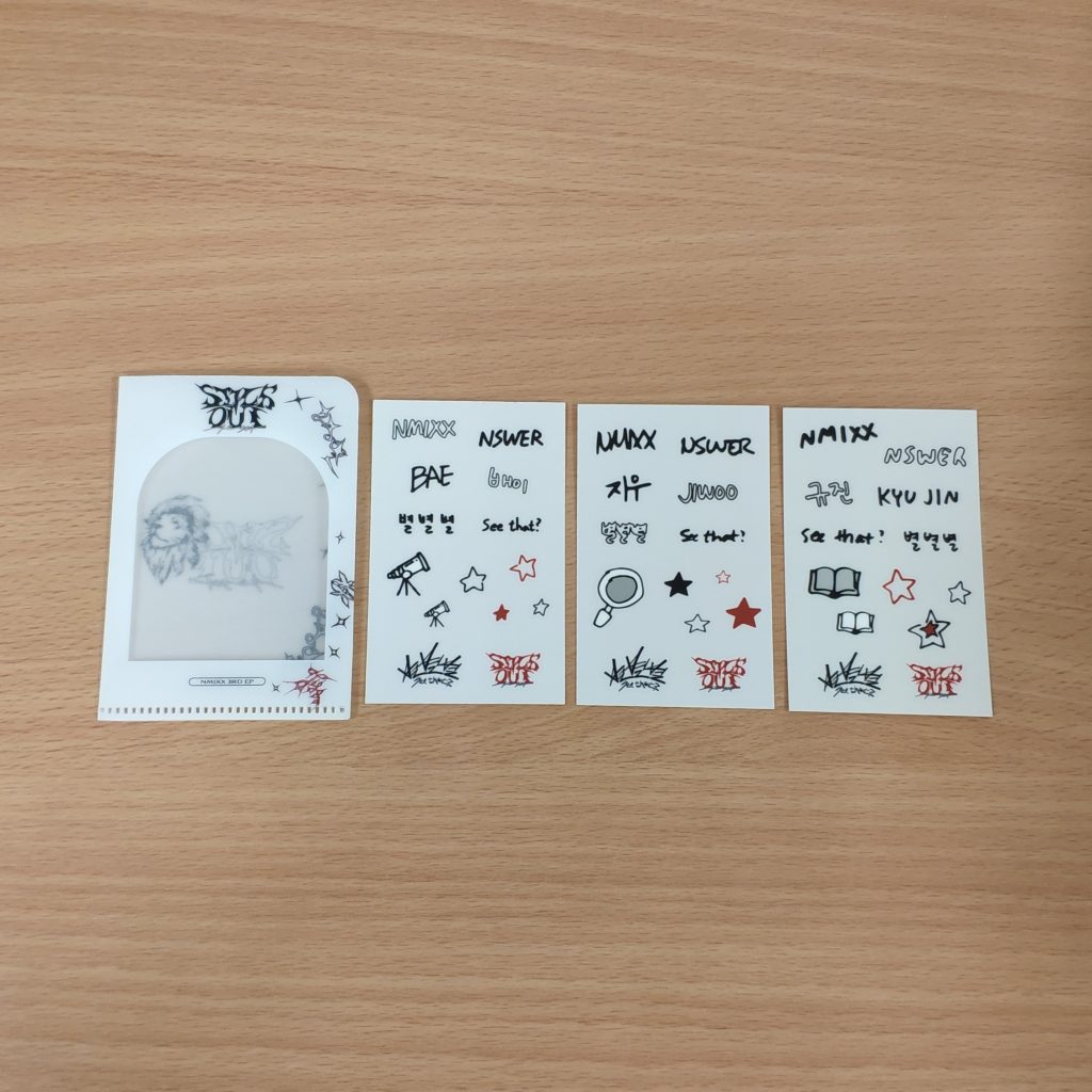 NMIXX Fe3O4: STICK OUT JYP POB STICKER + L-HOLDER TYPE A – dodatek od JYP SHOP dodawany w preorderze do zakupu SETu albumów NMIXX Fe3O4: STICK OUT. Kupujesz 1szt. mini L-holder + 1 zestaw 3 arkuszy handwriting stickers.