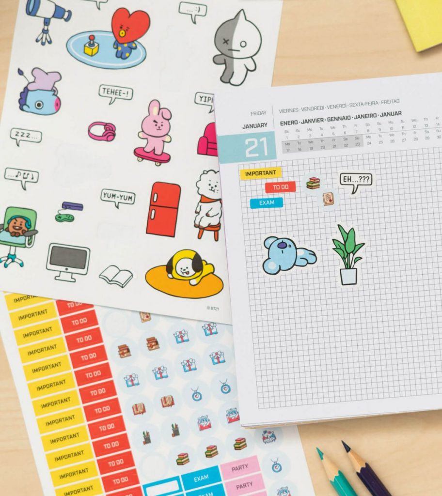Kalendarz w formie notesu pozwoli Ci mieć zawsze wszystkie ważne daty i informacje pod ręką! Zawiera 320 strony z miękką przednią i tylną okładką na spirali – wszystko ozdobione postaciami BT21. W środku znajdziesz 2 strony z kolorowymi naklejkami oraz kieszonkę na ważne karty, wizytówki czy dodatkowe materiały. Na pierwszej stronie możesz podać swoje dane, aby w razie zagubienia notes mógł trafić z powrotem do Ciebie! 🙂