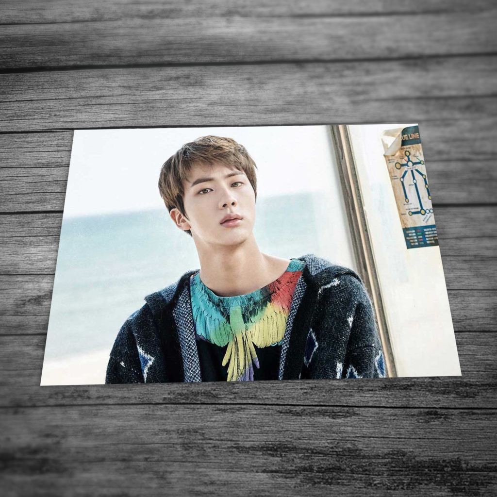 Zdjęcie z nadrukiem Jin z kpopowego zespołu Bangtan Boys. Wykonane na papierze fotograficznym o wymiarach 10x15cm. Do wyboru w dwóch wersjach wykończeniowych: macie lub błysku. Idealne do ozdobienia pokoju, antyramy czy jako pocztówka. Tylna strona zdjęcia nie jest zadrukowana, dlatego możesz na niej napisać ulubione teksty piosenek, motta, ozdobić rysunkiem czy napisać życzenia okolicznościowe.