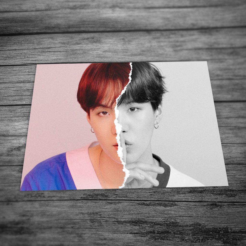 Zdjęcie z nadrukiem Suga z kpopowego zespołu Bangtan Boys. Wykonane na papierze fotograficznym o wymiarach 10x15cm. Do wyboru w dwóch wersjach wykończeniowych: macie lub błysku. Idealne do ozdobienia pokoju, antyramy czy jako pocztówka. Tylna strona zdjęcia nie jest zadrukowana, dlatego możesz na niej napisać ulubione teksty piosenek, motta, ozdobić rysunkiem czy napisać życzenia okolicznościowe.