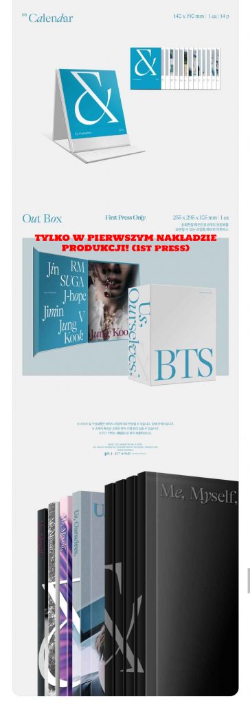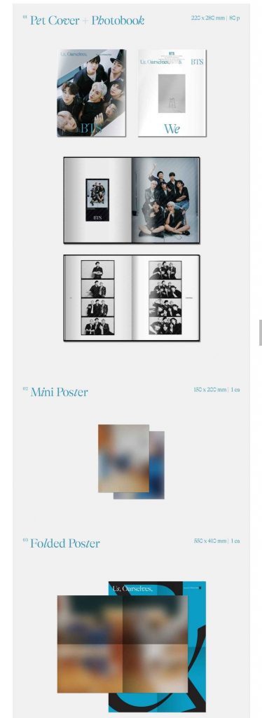 Oficjalny photobook Special 8 Photo-Folio Us, Ourselves, & BTS We SET koreańskiego zespołu BTS. Produkt miał swoją premierę w Korei 7 listopada 2022r. W zestawie znajdziesz m.in. Pet Cover + Photobook (80str.), Mini Poster (1szt.), Folded Poster (1szt.), Postage Stamp (1szt.), Photocard (losowo 1 z 7), 4×6 Photo Set (2szt.), BTS’s Item (Instant Photo) (1szt.), Calendar (1szt. 14str.).