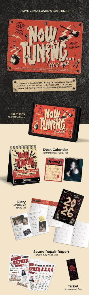 Oficjalny produkt STAYC 2026 SEASON’S GREETINGS NOW TUNING… 111.2MHz. Produkt będzie miał swoją premierę w Korei 10 grudnia 2025r. Zawartość prezentowana na zdjęciach.