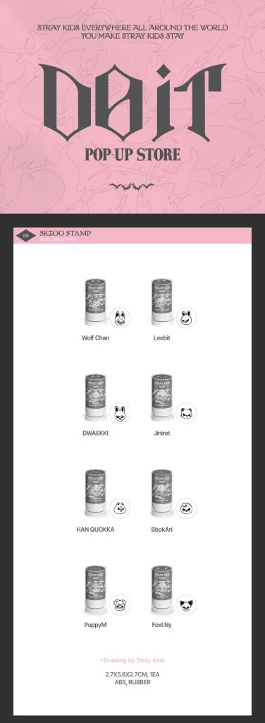 Oficjalny produkt STRAY KIDS DO IT POP-UP STORE SKZOO Stamp w jednej z ośmiu wersji. Produkt będzie miał swoją premierę w Korei 3 lutego 2026r. Kupujesz 1szt. pieczątki z wybraną postacią SKZOO.