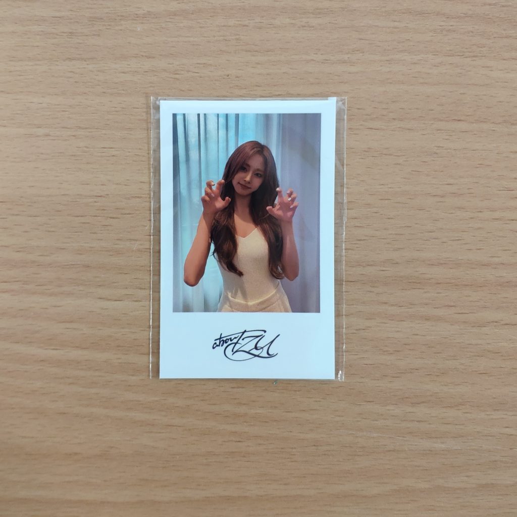 TZUYU abouTZU (Platform_Nemo Ver.) JYP Shop POB POLAROID PHOTOCARD TYPE A – dodatek od JYP Shop dodawany w preorderze do zakupu albumu TZUYU abouTZU (Platform_Nemo Ver.). Kupujesz 1szt. polaroid photocard w prezentowanym na zdjęciu wzorze.