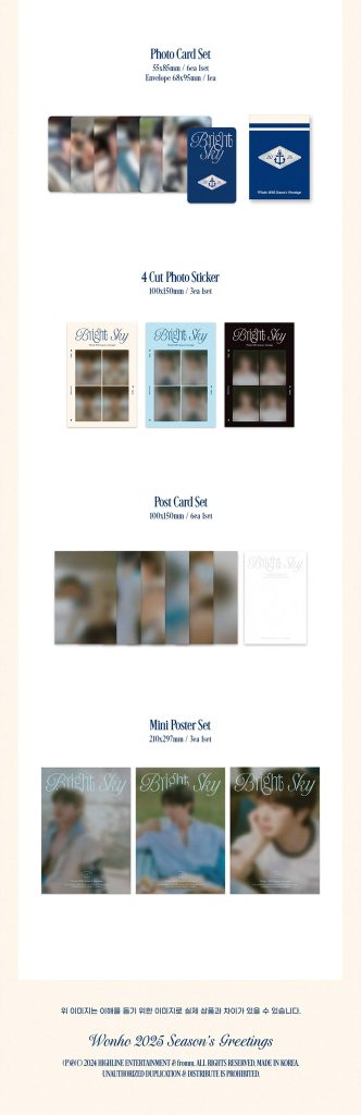 Oficjalny produkt WONHO 2025 SEASON’S GREETINGS BRIGHT SKY WALL CALENDER VER. Produkt będzie miał swoją premierę w Korei 31 grudnia 2024r.