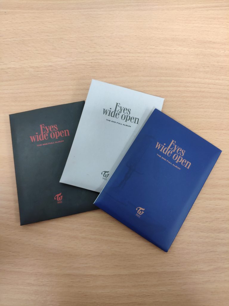 Zestaw 10 oficjalnych kart TWICE z albumu EYES WIDE OPEN (9 solowych + 1 grupowa) o wymiarach 8,8×5,8cm zapakowane w minikopertę widoczną na zdjęciach (kolor w zależności od wybranej wersji).
