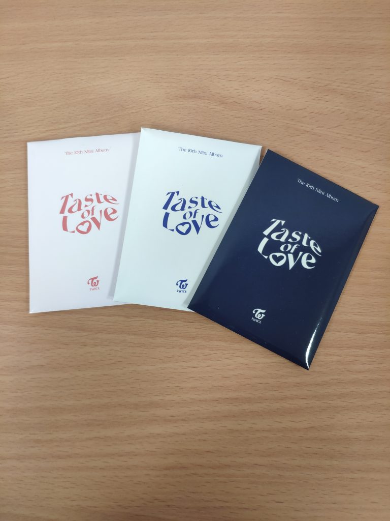 Zestaw 10 oficjalnych kart TWICE z albumu Taste of Love (9 solowych + 1 grupowa) o wymiarach 8,8×5,8cm zapakowane w minikopertę widoczną na zdjęciach (kolor w zależności od wybranej wersji).